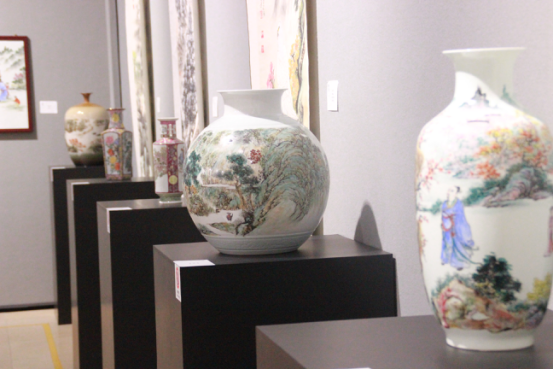 值得一提的是,劉致遠(yuǎn)除了展示山水、花鳥等畫作,同時(shí)帶來(lái)了多件精心創(chuàng)作的廣彩陶瓷作品,各種花瓶、茶具、餐具上,有人物、風(fēng)景以及動(dòng)物等彩色繪圖,雖為陶瓷擺設(shè)器具,卻也和書畫同樣具備細(xì)意觀賞的價(jià)值。