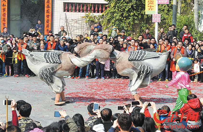 元宵節(jié),澄海蓮下鎮(zhèn)陳厝洲鄉(xiāng)一年一度的游神活動。巡游隊伍最有代表性的就是澄海“雙咬鵝舞”,始創(chuàng)于上世紀五十年代初,由于澄海盛產(chǎn)獅頭鵝,有“鵝鄉(xiāng)”之稱。故澄海人創(chuàng)制了獅頭鵝藝術(shù)造型。類似的例子還有潮汕地區(qū)的蜈蚣舞、蚌殼舞等,只有幾十年的歷史林桂炎 攝