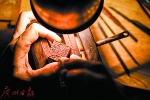 顧名思義,疊字印就是在印章的字上再刻字,下面的字細,上面的字粗?!翱桃粋€疊字印要兩天,如果是比賽的話,一個小時左右就能搞定?!表楉炃镎f。