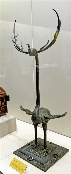 ▲曾侯乙幕出土戰(zhàn)國時期銅鹿角立鶴。