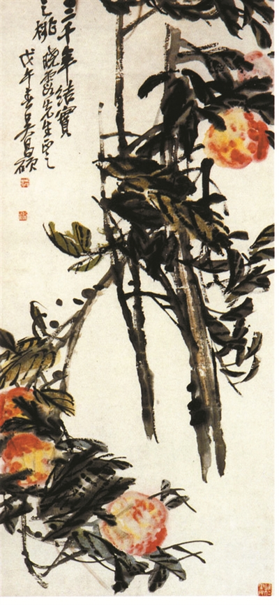 吳昌碩,原名俊,俊傾,字昌碩,別號(hào)缶廬、大龍、苦鐵等,浙江安吉人。“詩、書、畫、印”四絕的一代宗師,與任伯年、趙之謙、虛谷齊名為“清末海派四大家”?!度杲Y(jié)實(shí)之桃》,作于1918年。這幅作品運(yùn)用篆書筆法,疏闊縱放,雄渾有力,顯現(xiàn)出磅礴而茁壯的氣勢,筆力強(qiáng)悍,是吳昌碩大器晚成的絕佳寫照。