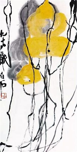 齊白石的《葫蘆》,被稱為是齊白石的絕筆,據(jù)說當時齊白石為了畫這幅畫,一天早晨起來,沒有人攙扶,他自己從臥室踉踉蹌蹌地走進畫室,站在桌前,擼起袖子,畫下了這一幅畫。據(jù)畫家李可染回憶,當時的齊白石已經(jīng)是老糊涂了,“九”字不知道該怎么寫,到了“歲”就直接寫錯了,只能夠憑自己的直覺畫畫,即便是畫了一輩子的畫,但是到最后由于體力和腦力的不支,實在是畫不出來了。齊白石一開始用黃墨去畫葫蘆,畫下正確的一筆,一大一小,一前一后,一上一下。但當他接著去畫葉子的時候出錯了,把葉子順即也畫成了葫蘆,且葫蘆留白處冒出兩筆淡墨,就好像葫蘆被打了兩個洞。當畫藤蔓時,又恍惚了,畫著畫著又成葫蘆了。齊白石老人在做這幅畫時已經(jīng)是精力透支了,能畫出樣子來已經(jīng)實屬不易了,但是我們可以看到,其實齊老畫的這幅畫是別有一番風韻在的,比如說他畫的藤蔓,這藤蔓真是絕了,能夠在不知不覺中畫出葫蘆的成熟、滄桑,把經(jīng)過風吹雨打后形成的那種彎曲,表現(xiàn)得淋漓盡致。