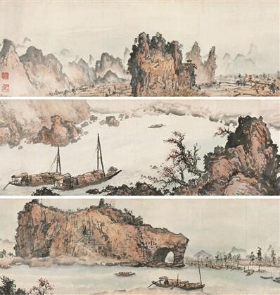 關(guān)山月白天外出寫生,晚上整理寫生畫稿,獲得了一大批寫生作品。秀美的桂林山水激發(fā)了他的創(chuàng)作熱情,引發(fā)了他的創(chuàng)作靈感,他覺得應(yīng)該進(jìn)行大的創(chuàng)作,把百里漓江兩岸勝景盡收畫卷之中。但是,他所住的七星巖公寓,又小又暗,只有一張小桌子,施展不開。而且,他還欠了一大筆租金,住不下去了。幸好得到李焰生的幫助,住進(jìn)其家,得以在李家的客廳里作畫,桌子不夠?qū)?,他就把紙鋪在地板上蹲、趴著畫。奮戰(zhàn)了月余,終于完成了一幅32.8厘米×2850厘米的長卷《漓江百里圖》,開創(chuàng)了廣西的“漓江畫派”風(fēng)格。
