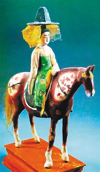 但細看這幅圖,所謂“羃”只是在寬檐帽下垂有帶狀物,不足以將全身遮蔽,很難說真的就是“羃”。因此關于“羃”的形制,還有待文物資料的繼續(xù)發(fā)現?!傲]”之外,“帷帽”的形制又是如何?從上面的介紹可知,帷帽的特點是“拖裙到頸,漸為淺露”。從這一點出發(fā),1972年新疆吐魯番唐墓出土的“彩繪騎馬仕女泥俑”,有人認為所戴就是帷帽。