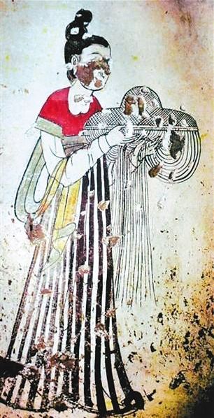 一個社會的文明程度、文化交流程度,乃至思想意識等等,都可以在女性裝束中反映出來。時至隋唐,唐代服飾進行了很大的變革。其中唐代女裝在歷史上尤為著名。唐代國家統(tǒng)一,經濟繁榮,社會更加開放,服飾愈益華麗。在婦女中間,出現了袒胸露臂的形象。在永泰公主墓東壁壁畫上,有一個梳高髻、露胸、肩披紅帛,上著黃色窄袖短衫、下著綠色曳地長裙、腰垂紅色腰帶的唐代婦女形象,從而使人們對“粉胸半掩疑暗雪”,“坐時衣帶縈纖草,行即裙裾掃落梅”有了更形象的理解——