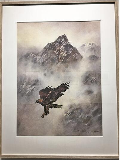 雄鷹展翅翱翔、盤旋于海灣、高山的上空,這是蔣燁教授水彩畫中的場(chǎng)景。概括凝練的風(fēng)景,氣度非凡的飛鷹,一動(dòng)一靜間把融合中國(guó)傳統(tǒng)文化的現(xiàn)代水彩語(yǔ)境表現(xiàn)得酣暢淋漓。開幕當(dāng)天,蔣燁將畫作《?!棥焚?zèng)送給了龍崗區(qū)人民政府。