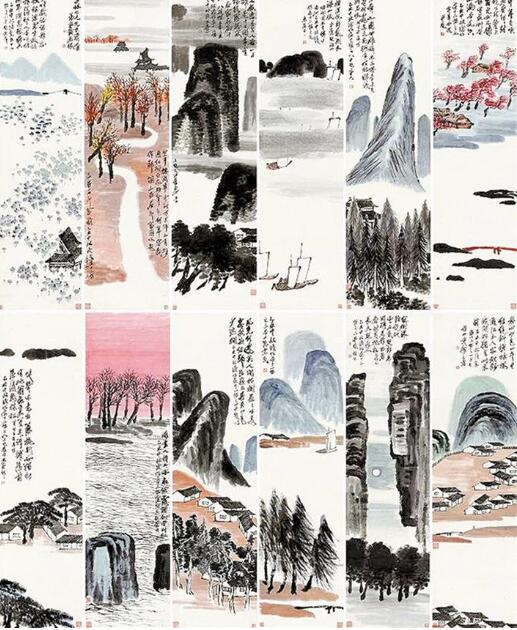 《山水十二條屏》每條屏形制整齊劃一,均為縱180厘米,橫47厘米,內容包括:《江上人家》《石巖雙影》《板橋孤帆》《柏樹森森》《遠岸余霞》《松樹白屋》《杏花草堂》《煙深帆影》《杉樹樓臺》《山中春雨》《板塘荷香》《紅樹白泉》。當把它們置于一處,便可以完整地呈現出齊白石筆下的美好家園情景——長天落日、桂林山水、浮萍山影、小橋流水,濃郁的東方家園情愫撲面而來。據悉,存世的《山水十二條屏》僅有兩套,另一套現收藏在重慶博物館。