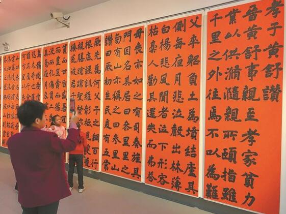 據(jù)了解,此次展覽不同于普通的書法展,而是以“孝德”為內(nèi)容的主題創(chuàng)作展,所有作品都圍繞孝文化進行創(chuàng)作,每一幅作品都在講述一個關(guān)于孝文化的故事。在“孝德”大主題下,又分了幾個小專題,比如“二十四孝專題”“孝經(jīng)專題”“金石題跋專題”,還有本土的“孝德寶安專題”。當(dāng)天的展覽吸引了大量觀眾,不少觀眾還帶著小孩參觀,黃女士告訴記者,“今天帶著小孩來,一是欣賞書法,二是希望小孩了解一下傳統(tǒng)的孝德文化,我們通過書法還了解到寶安孝子黃舒的故事。”