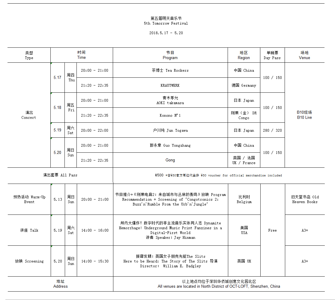 深圳新聞網(wǎng)訊 五月既至,好事即將發(fā)生。由深圳華僑城創(chuàng)意文化園主辦的第五屆明天音樂節(jié)將于2018年5月17日至20日在B10現(xiàn)場舉行。本屆明天音樂節(jié)作為“有形無界”華僑城創(chuàng)意文化園文博會(huì)分會(huì)場系列活動(dòng)的重點(diǎn)項(xiàng)目,將邀請來自6個(gè)國家的7組音樂家/藝術(shù)家,呈現(xiàn)包括演出、講座、紀(jì)錄片放映在內(nèi)的多元節(jié)目。除此之外,策展人將于5月13日在舊天堂書店做節(jié)前預(yù)熱,屆時(shí)會(huì)有節(jié)目介紹環(huán)節(jié)和一場完整的放映活動(dòng)。