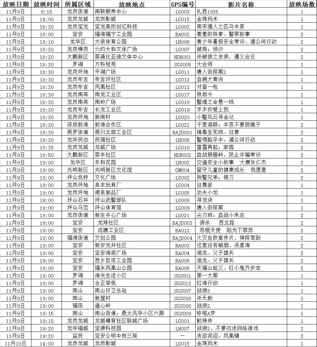 【深圳市萬場電影惠百姓】今晚11月9日(星期五)露天免費(fèi)放映電影安排
