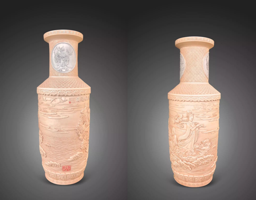 這是曹愛(ài)勤首次參加深圳文博會(huì),帶來(lái)了她所創(chuàng)作的陶瓷、篆刻、書畫等多種形式的藝術(shù)作品,可以看到其不同形式作品的創(chuàng)作技法、主題、表現(xiàn)手法等均有較大差異,充分體現(xiàn)了曹愛(ài)勤在陶瓷藝術(shù)道路上追求卓越、勇于創(chuàng)新的新時(shí)代大國(guó)工匠精神。在其創(chuàng)作中,特別是作為中國(guó)陶瓷重要組成部分的陶瓷雕刻作品《色靜深松里》、《八仙過(guò)?!?,承載了國(guó)畫、雕刻、裝飾等綜合性藝術(shù)手法,每件作品都充分體現(xiàn)出工匠技能,堪稱學(xué)貫中西、熔鑄古今之珍品。