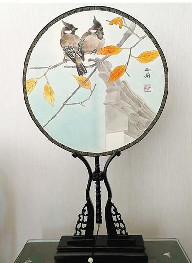 景麗莉創(chuàng)作的團扇《晨鳥飛啼棲枝頭》。