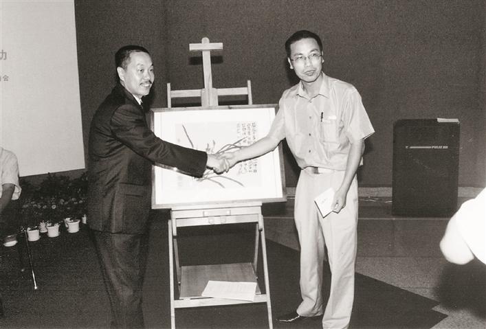 2005年7月,陳湘波(左)出席“情系災(zāi)區(qū)奉獻(xiàn)愛心——深圳市文化系統(tǒng)書畫作品賑災(zāi)義賣活動”。