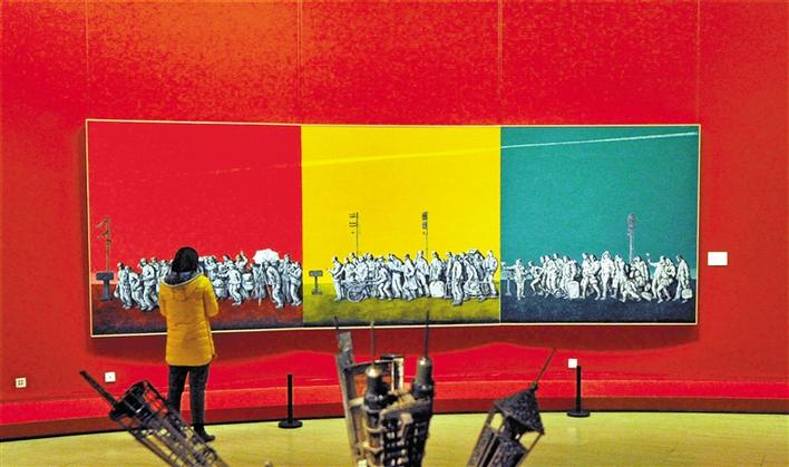 進(jìn)入中國(guó)美術(shù)館正中圓廳,巨幅三聯(lián)作《時(shí)代之歌——闖·創(chuàng)·窗》格外令人矚目。廣東省美術(shù)家協(xié)會(huì)副主席、深圳市文聯(lián)專職副主席梁宇向記者表示,“我畫的是不同時(shí)期的普普通通的深圳建設(shè)者,正是他們鑄就了深圳發(fā)展的奇跡。”