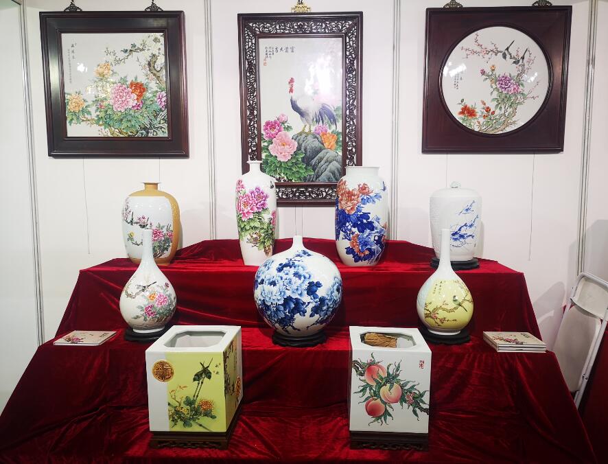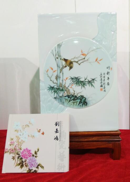 江西省陶瓷技能大師、江西省高級工藝美術師、惲派花鳥第十二代傳人、景德鎮(zhèn)青年陶瓷藝術家劉嘉鴻此次展會展出的陶瓷藝術作品共計35件,包含瓷板畫、瓷瓶、瓷盤、青花瓷、青花斗彩瓷等,其中《春滿園》、《錦堂富貴》、《長壽圖》等作品呈現(xiàn)陶瓷技藝,展示出劉嘉鴻深厚的藝術造詣。