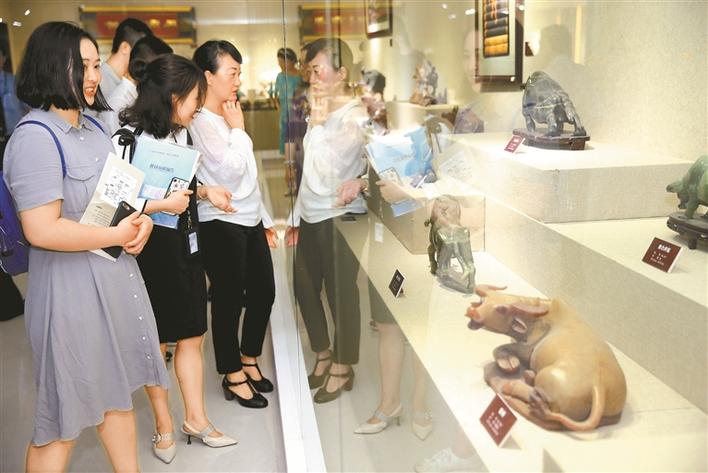 牛雕、牛繡、牛畫……厲有為無償捐贈的1400余件牛藝術品來自不同的國家和地區(qū),形成于不同的歷史時期,包括玉石、金屬、陶瓷、竹木、刺繡、剪紙、書畫等各種材質和工藝,具有重要的歷史文化價值和深刻的精神內涵。比如,有一尊戰(zhàn)國銅牛的收藏品,造型生動、設計精巧、工藝考究,牛脖子上雕刻的是長冠鳳圖案,牛背上雕刻的是太陽圖案,牛身上是龍鳳紋。