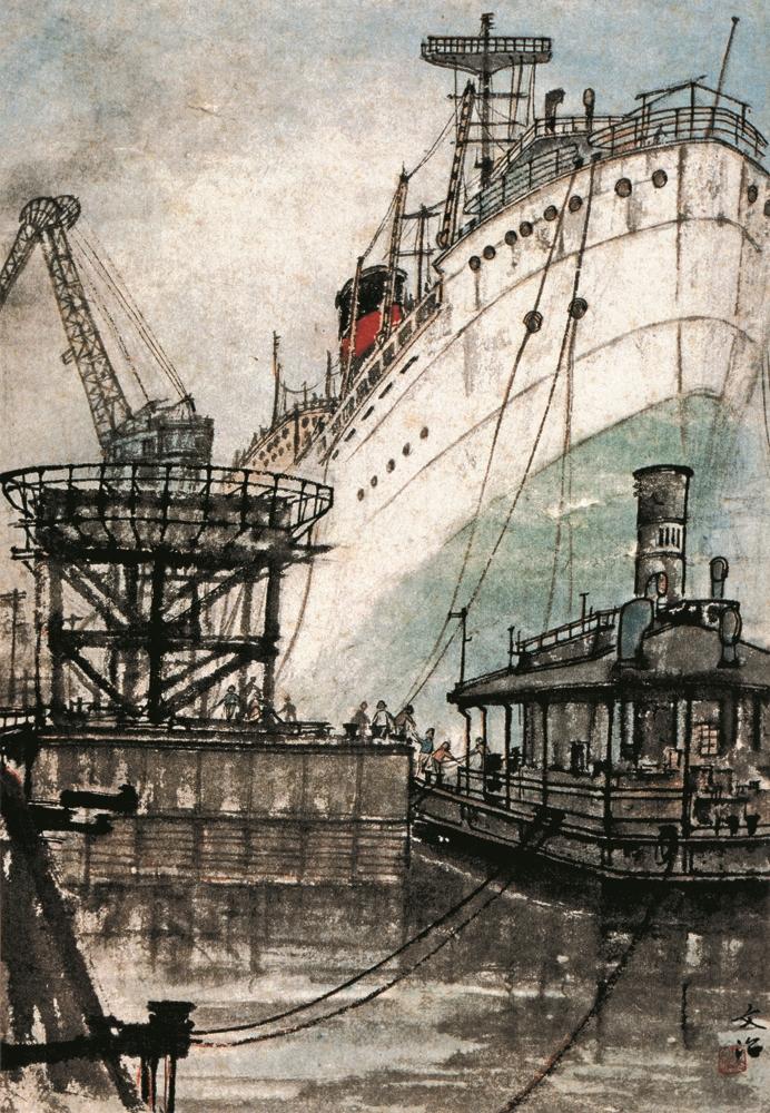 宋文治對廣東地區(qū)的關(guān)注始于20世紀(jì)的60年代。他在1960年參加江蘇國畫院組織的行程二萬三千里的寫生活動中,經(jīng)過廣州時就創(chuàng)作了《廣州造船廠》,罕見地運用山水畫技法表現(xiàn)現(xiàn)代工業(yè)題材。