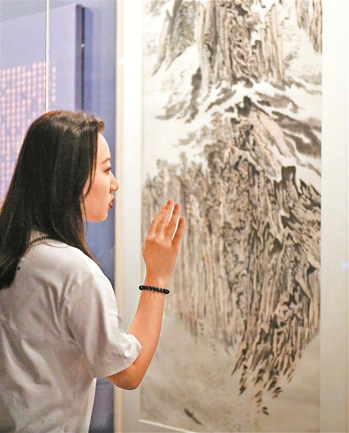 展覽一經(jīng)推出,就迅速吸引了絡(luò)繹不絕的市民前來參觀。面對暑期人流量大的情況,關(guān)館特地推出了豐富多樣的公共教育服務(wù)。不僅有志愿者導(dǎo)覽,還有親子工作坊、數(shù)字化設(shè)計(jì)等等,內(nèi)容接地氣,趣味橫生。記者看到不少孩子都在家長的指引下拿著畫本在美術(shù)館里臨摹、學(xué)習(xí),通過這種方式與國畫家們一起交流切磋。