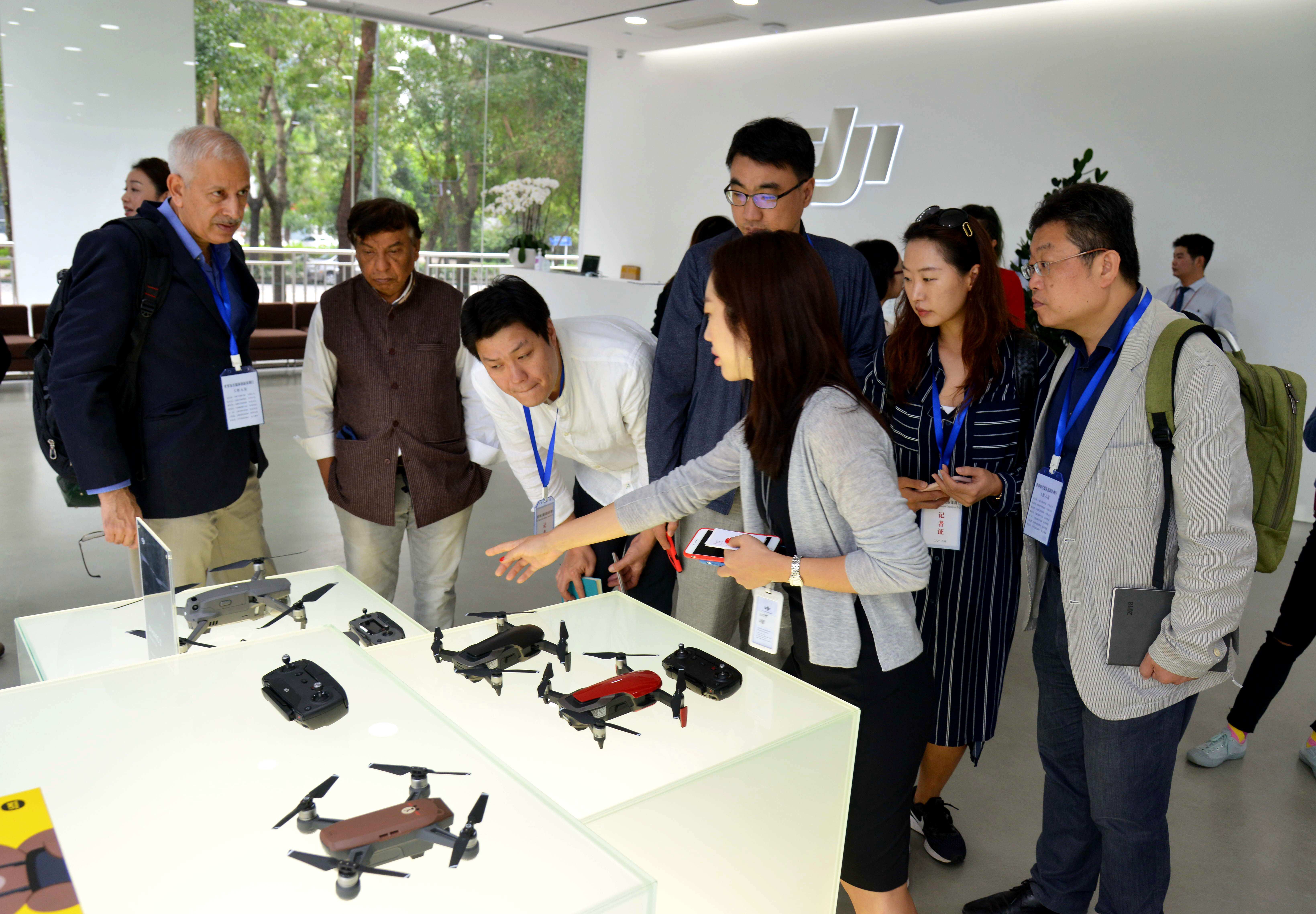 各國(guó)記者們?cè)诖蠼畡?chuàng)新科技有限公司參觀無人機(jī)產(chǎn)品。