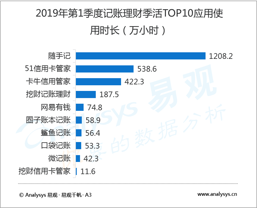 在使用時長方面,記賬行業(yè)內(nèi)使用時長的梯隊效應仍然十分顯著,隨手記以1208萬小時排名第一,以絕對優(yōu)勢位列第一梯隊。51信用卡管家和卡牛信用管家分別以538.6和422.3萬小時排名第二、三位,位列第二梯隊,第三梯隊的使用時長差距較小,競爭十分激烈。