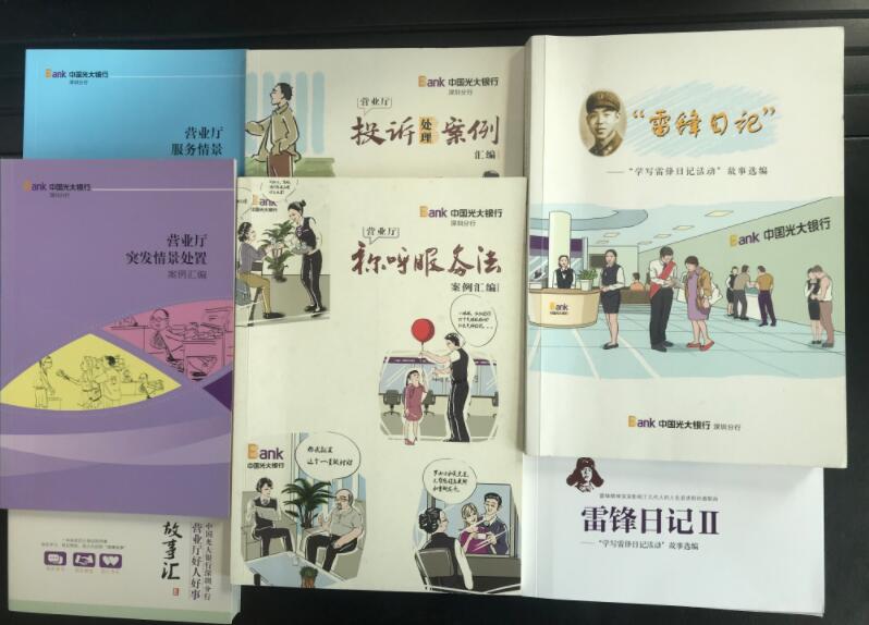光大銀行深圳分行在組織開展上述活動中發(fā)現,一線員工用樸素的文字記述著服務客戶的點滴事例,詮釋著對優(yōu)質服務的理解和追求,弘揚著具有光大特色的家園文化、陽光文化,字里行間飽含著對光大事業(yè)的忠誠和熱愛,看到了員工中蘊含著巨大的工作熱情和創(chuàng)造力。為更好鼓勵員工積極性,在深圳分行領導支持下,深圳分行陽光服務辦每年將員工發(fā)表的案例進行認真篩選編輯,署上員工姓名,聘請專業(yè)美術人員配圖插畫,再印制成精美的書籍,供大家日常學習和收藏。從2013年開始至2019年的7年間,深圳分行先后將員工發(fā)表的文章案例印制了《廳堂服務情景案例》、《營業(yè)廳突發(fā)情景處置案例匯編》、《營業(yè)廳好人好事故事匯》、《投訴處理案例》、《稱呼服務法》、《雷鋒日記-學寫雷鋒日記活動故事選編》、《雷鋒日記II-學寫雷鋒日記活動故事選編》共計7本書籍。