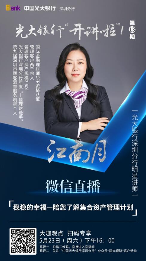 此次,光大銀行深圳分行攜手《深圳晚報》邀請CFP資格認(rèn)證國際金融理財師、該行年度“十佳理財能手”、明星講師江南月帶來《穩(wěn)穩(wěn)的幸?!隳私饧腺Y產(chǎn)管理計劃》主題分享,幫助更多客戶深入了解并購買集合資產(chǎn)管理計劃產(chǎn)品。講師江南月將從集合資產(chǎn)管理計劃的基本概念和產(chǎn)品優(yōu)勢出發(fā),深入淺出,讓更多客戶了解集合資產(chǎn)管理計劃產(chǎn)品,并幫助客戶選擇購買這類產(chǎn)品。該行代銷的純債類集合資產(chǎn)管理計劃一直以來都以穩(wěn)健著稱,目前已到期產(chǎn)品全部達(dá)到了業(yè)績比較基準(zhǔn),設(shè)置超額收益的產(chǎn)品也都為客戶實(shí)現(xiàn)了超額回報。
