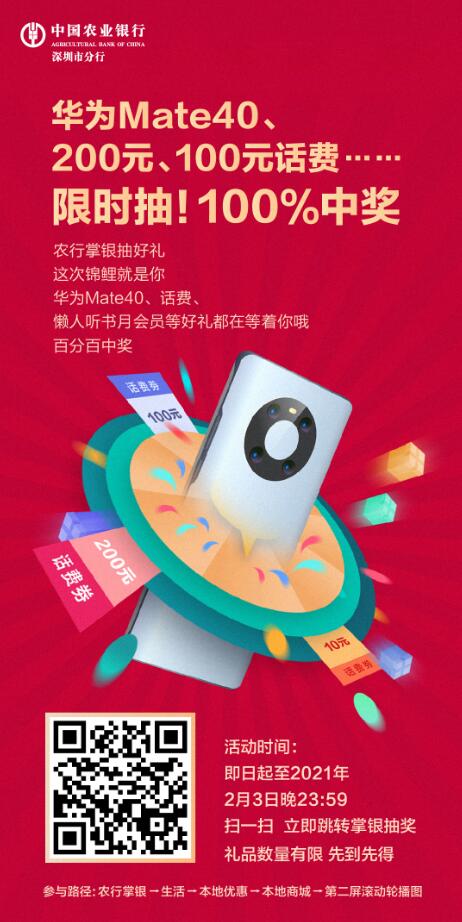 深圳新聞網(wǎng)·見(jiàn)圳客戶端2021年1月2日訊 農(nóng)歷新年越來(lái)越近,農(nóng)行掌銀讓您足不出戶,動(dòng)動(dòng)手指抽好禮,這次錦鯉就是你!華為Mate40、200元話費(fèi)、100元話費(fèi)等好禮,限時(shí)抽。