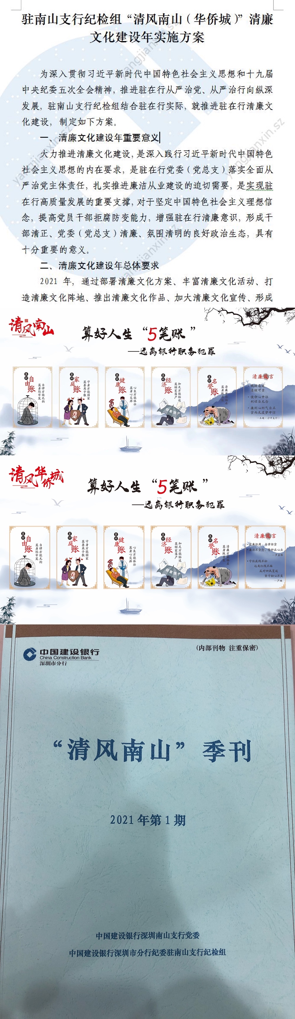 深圳新聞網(wǎng)6月9日訊 為充分發(fā)揮清廉文化的教育、激勵、凝聚、導向和約束作用,響應深圳銀行業(yè)保險業(yè)清廉金融文化核心理念,積極培育厚德養(yǎng)廉的政治生態(tài),著力助推駐在行干部清正、黨委清廉、政治清明、生態(tài)清朗的清廉文化建設,近日,建行深圳市分行駐南山支行紀檢組制定推出了《“清風南山(華僑城)”清廉文化建設年實施方案》。該方案以“6講”為依托,明確清廉文化建設5大任務,即:弘揚清廉價值理念、豐富清廉文化活動、打造清廉文化陣地、推出清廉文化作品、攜手清廉文化共建。