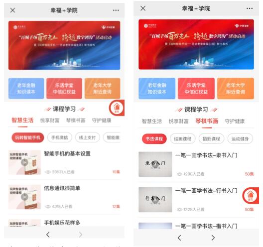 中信銀行專(zhuān)門(mén)給老年朋友準(zhǔn)備的“課程學(xué)習(xí)”一共有智能生活、悅享財(cái)富、琴棋書(shū)畫(huà)和守護(hù)健康四大板塊,都是老年朋友需要和關(guān)心的內(nèi)容,總課程2000余節(jié),總時(shí)長(zhǎng)超過(guò)1.8萬(wàn)分鐘。