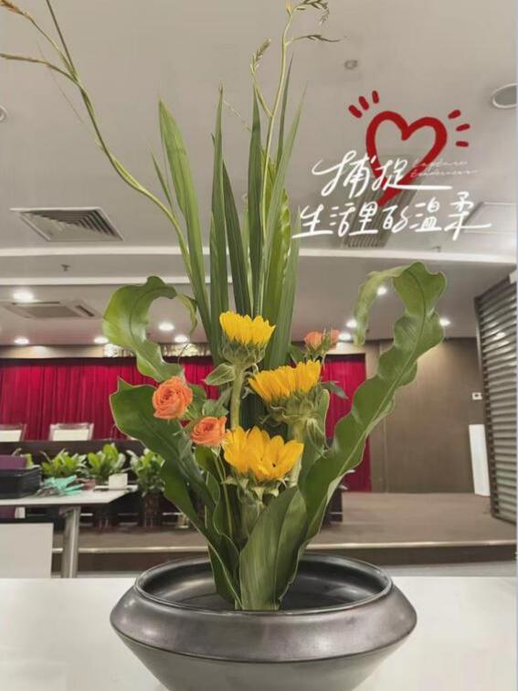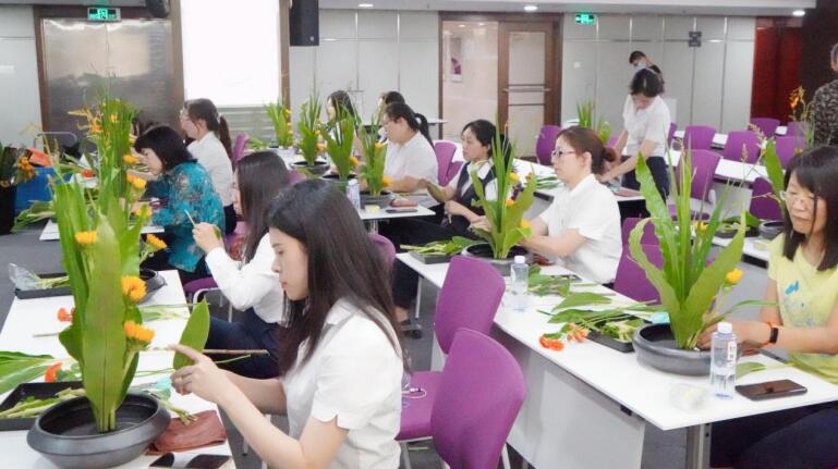 活動現(xiàn)場,馮老師詳細介紹了傳統(tǒng)花藝的歷史文化、插花造型、色彩搭配、器具應(yīng)用等基礎(chǔ)知識,從花語寓意、花材修剪、構(gòu)圖等方面深入淺出的講解插花的要點。在悠然的花香浸染間,輕柔的音樂熏陶中,大家按照馮老師展示的步驟,將花朵、樹葉精心剪裁、混搭、點綴成束,將一朵一朵鮮花、綠葉錯落有致地插在花盆中里,普通的花葉、枝條,經(jīng)過大家精巧的修飾與加工之后,變成了令人賞心悅目的藝術(shù)品。整個會場花香四溢,歡聲笑語,充滿了輕松歡快的氛圍。