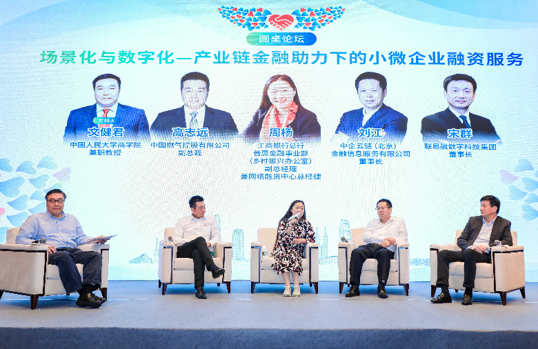 在論壇對話環(huán)節(jié),工行總行普惠金融事業(yè)部副總經理兼網絡融資中心總經理周楊、核心企業(yè)代表中國燃氣控股有限公司副總裁高志遠、供應鏈服務機構代表中企云鏈(北京)金融信息服務有限公司董事長劉江和聯(lián)易融數字科技集團董事長宋群共同探討了如何以融合和創(chuàng)新方式,通過產業(yè)鏈金融助力小微企業(yè)融資服務,互相交換在產業(yè)鏈金融發(fā)展方面的經驗和智慧。