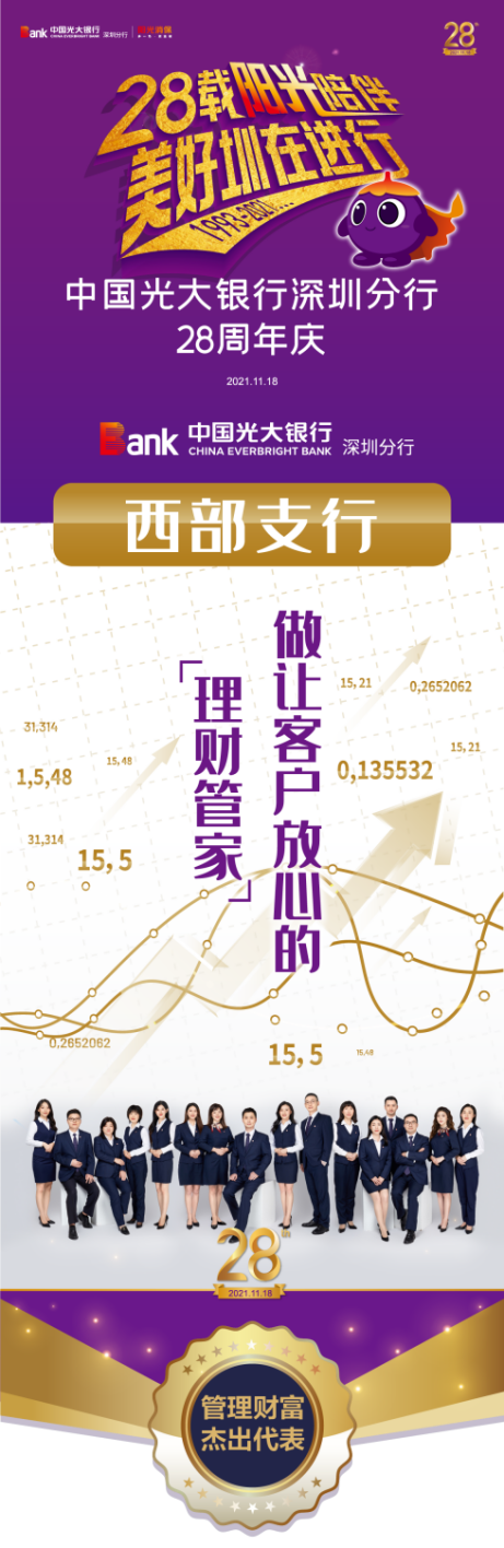 作為財富管理業(yè)務的先行者,光大銀行一直致力追求做讓客戶放心的“理財管家”。西部支行始終堅定朝著總分行打造“一流財富管理銀行”的戰(zhàn)略目標方向趕超奔跑,建設專業(yè)的財富管理團隊,管理財富,服務民生。在光大銀行深圳分行28周年的“十大最美光陰故事”管理財富類評選中,西部支行脫穎而出,獲評管理財富杰出代表。