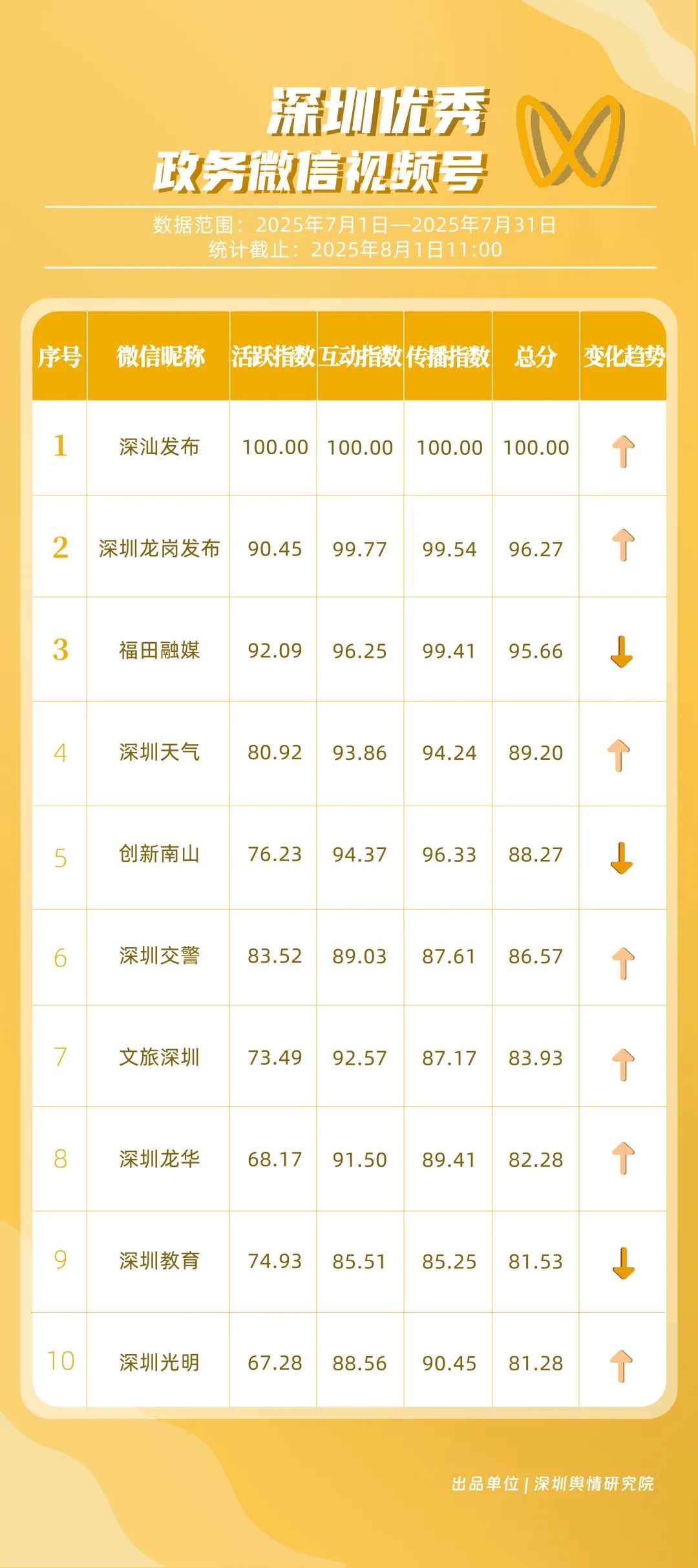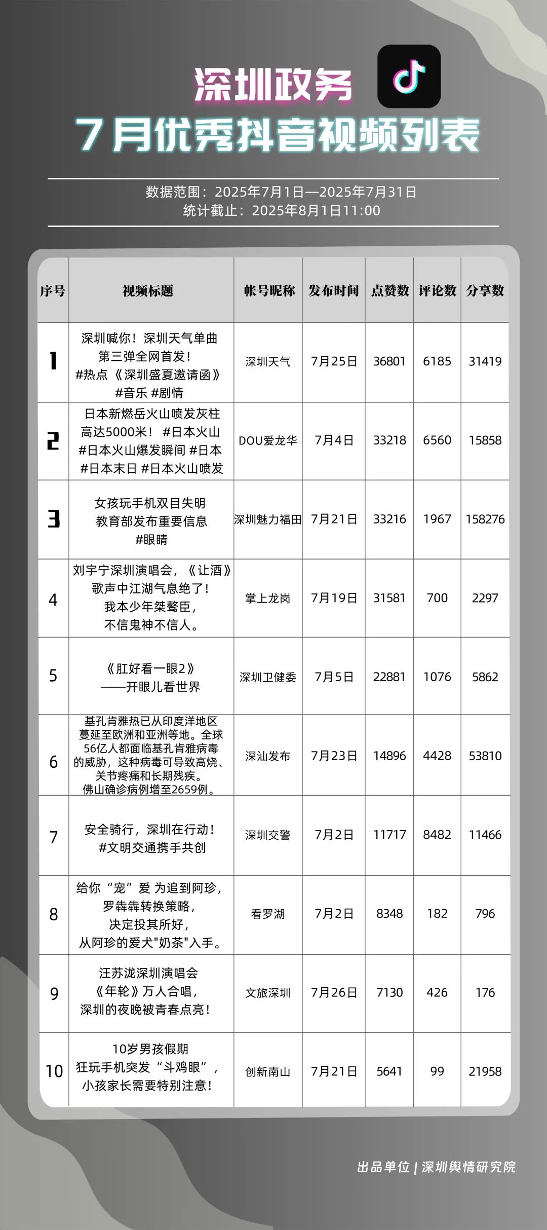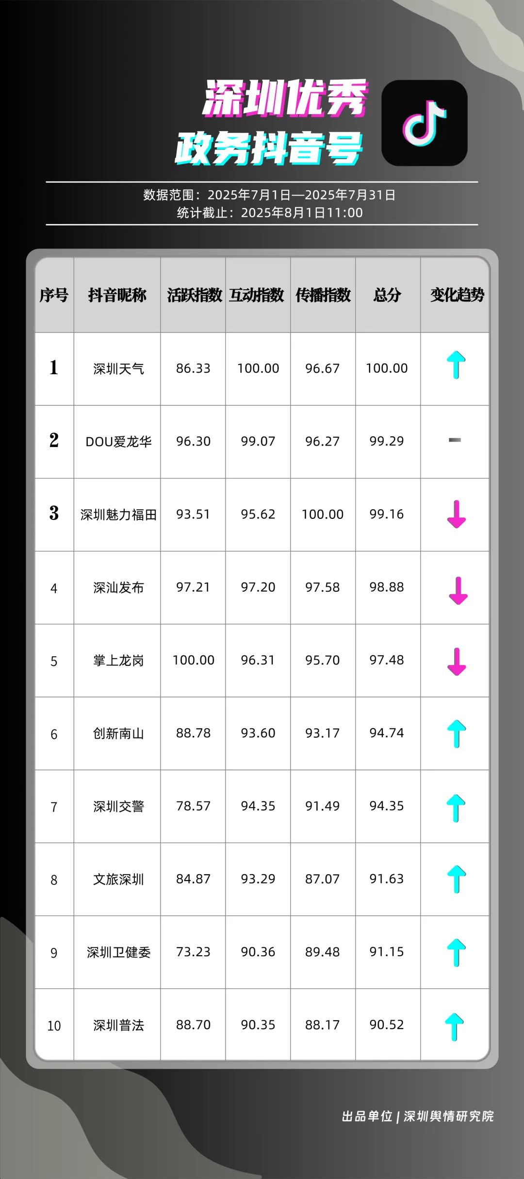 7月,“深圳天氣”“DOU愛龍華”“深圳魅力福田”“深汕發(fā)布”“掌上龍崗”“創(chuàng)新南山”“深圳交警”“文旅深圳”“深圳衛(wèi)健委”“深圳普法”共10個(gè)政務(wù)抖音號(hào)獲得“優(yōu)秀政務(wù)抖音號(hào)”稱號(hào)。其中,“深圳天氣”互動(dòng)指標(biāo)獲滿分,憑借氣象與趣味相結(jié)合的創(chuàng)新科普形式,領(lǐng)跑優(yōu)秀政務(wù)抖音號(hào);“DOU愛龍華”“深圳魅力福田”分別位列第二、三名,通過聚焦網(wǎng)絡(luò)熱點(diǎn)、挖掘創(chuàng)意內(nèi)容,不斷提升傳播效能,展現(xiàn)出強(qiáng)大的政務(wù)新媒體影響力;“深汕發(fā)布”“掌上龍崗”“創(chuàng)新南山”等賬號(hào)緊隨其后,上榜的優(yōu)質(zhì)政務(wù)抖音號(hào)用短視頻語言強(qiáng)化傳播效果,展現(xiàn)了鮮明的賬號(hào)特色和風(fēng)采。