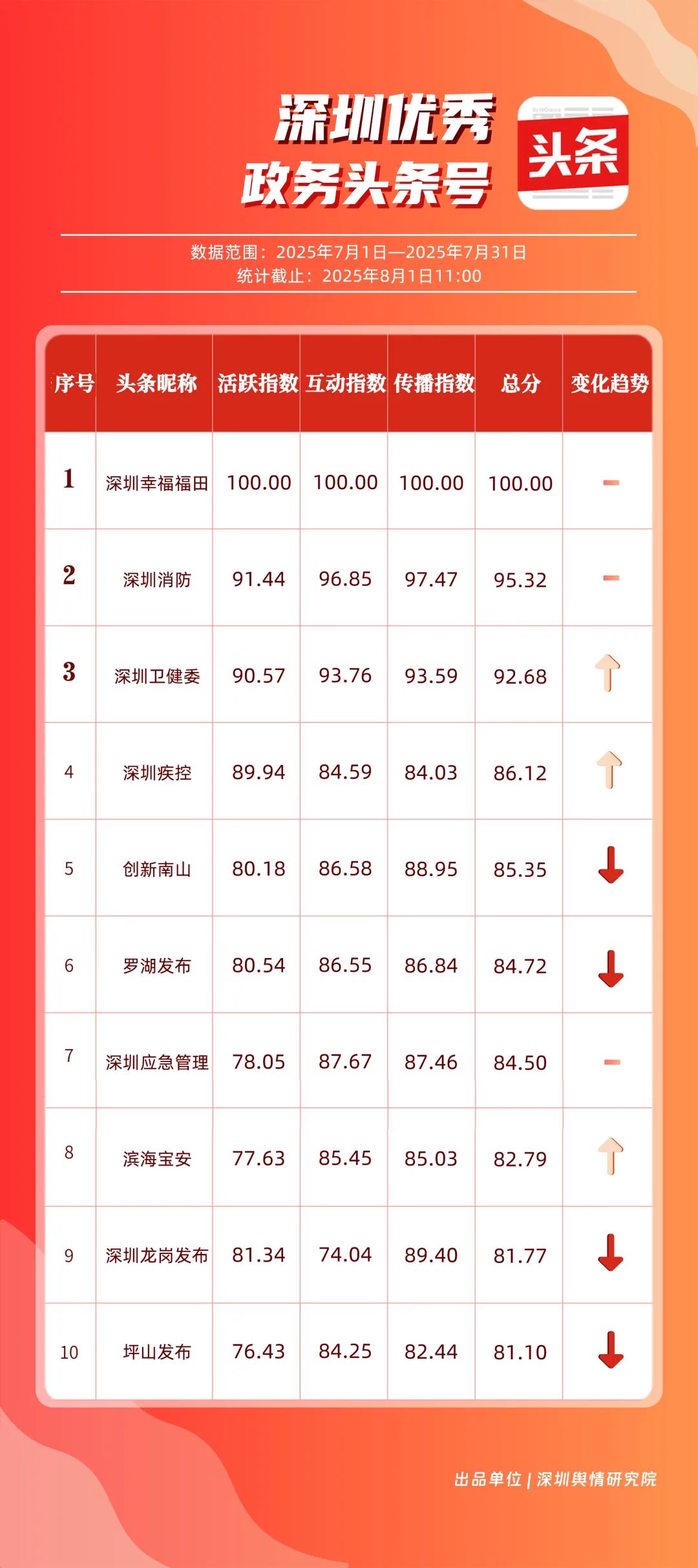 7月,“深圳幸福福田”“深圳消防”“深圳衛(wèi)健委”“深圳疾控”“創(chuàng)新南山”“羅湖發(fā)布”“深圳應(yīng)急管理”“濱海寶安”“深圳龍崗發(fā)布”“坪山發(fā)布”共10個(gè)政務(wù)頭條號(hào)入選“優(yōu)秀政務(wù)頭條號(hào)”榜單。“深圳幸福福田”“深圳消防”憑借優(yōu)質(zhì)內(nèi)容持續(xù)吸引用戶關(guān)注,穩(wěn)居前二;“深圳衛(wèi)健委”表現(xiàn)亮眼,評(píng)分達(dá)92.68分,排名較6月有所上升;“深圳疾控”同樣進(jìn)步明顯,在疾病預(yù)防控制信息傳播上發(fā)揮了重要作用?!皠?chuàng)新南山”“羅湖發(fā)布”“深圳應(yīng)急管理”等上榜賬號(hào),也各展所長(zhǎng),始終將優(yōu)質(zhì)內(nèi)容作為核心抓手,成為政務(wù)新媒體領(lǐng)域內(nèi)容創(chuàng)作與傳播的典范。