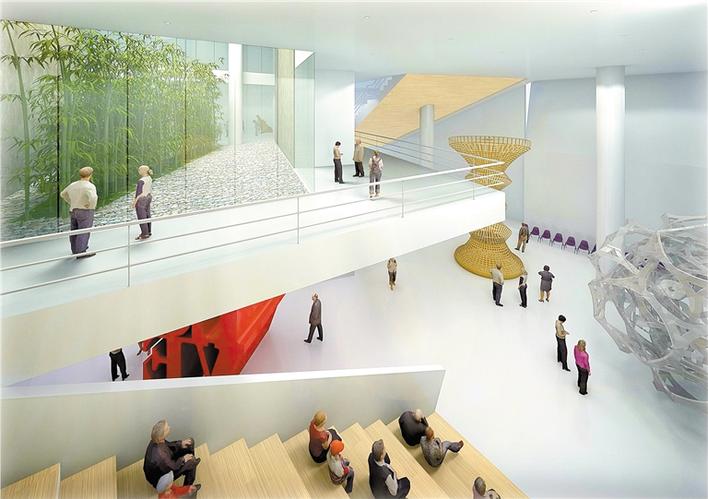 記者在現(xiàn)場看到,整個建筑由中國設(shè)計和當(dāng)代設(shè)計兩大主題館立體互相扣合而成,地面設(shè)計為全開放空間,可連接小鎮(zhèn)大街,下沉式庭院,亦可為不同活動或展覽提供空間,打造為區(qū)域中的藝術(shù)核心文化廣場。