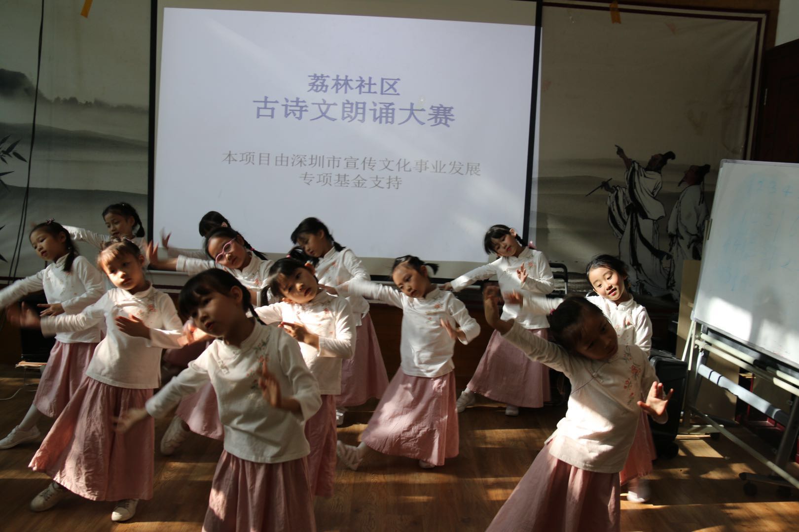 比賽結束后,荔林社區(qū)歡樂頌朗誦隊為大家?guī)砹怂麄冏孕袆?chuàng)作的《唐詩里的中國》,引發(fā)現(xiàn)場觀眾的熱烈掌聲。而城市山林幼兒園小朋友在老師的帶領下為大家?guī)砹宋璧副硌荨栋偕菩橄取?,小朋友們可愛的舞姿引起了觀眾的陣陣喝彩。最后,評委們?yōu)楂@獎的選手頒發(fā)了獎杯,本次比賽也在社區(qū)居民的依依不舍中圓滿結束。