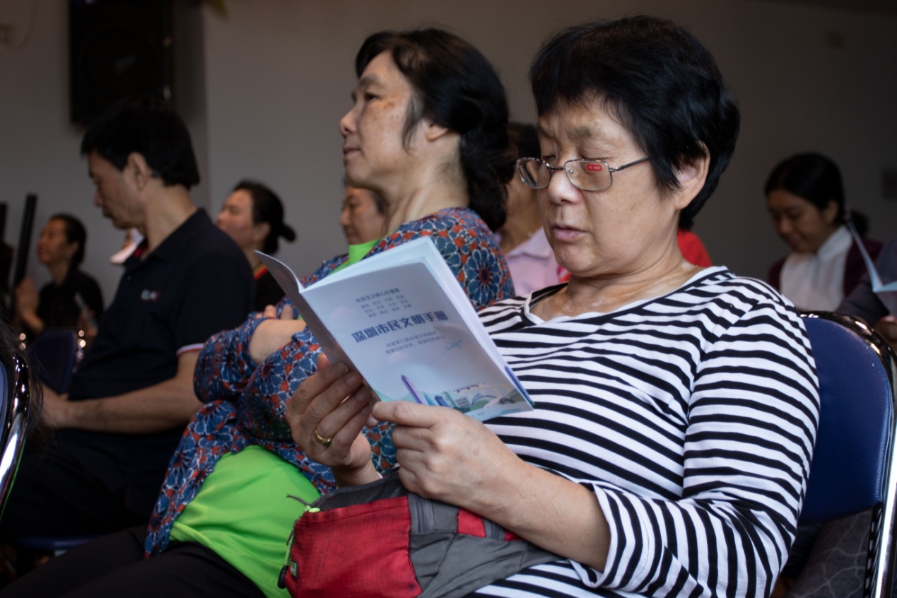 11月13日上午,本系列活動的第六場講座在龍聯(lián)社區(qū)工作站拉開了序幕。講座開始前,現(xiàn)場聽眾每人手上都拿到一本《深圳市民公約》小手冊和《漢字與修身智慧》學(xué)習(xí)資料,劉建彪老師首先跟大家互動:“我們需要什么樣的家園?文明城市從哪里開始?”“美麗、溫馨、文明、和諧的家園”,臺下一位叔叔的聲音尤其洪亮,劉老師及時肯定了他的回答。劉老師接著說,文明城市從人開始,人是建設(shè)文明城市的中堅力量,他進(jìn)一步補充道,做文明人的第一步是轉(zhuǎn)變思想,只有了解并認(rèn)同文明的重要性,才會自覺地踐行文明禮儀,積極參與城市文明的創(chuàng)建。