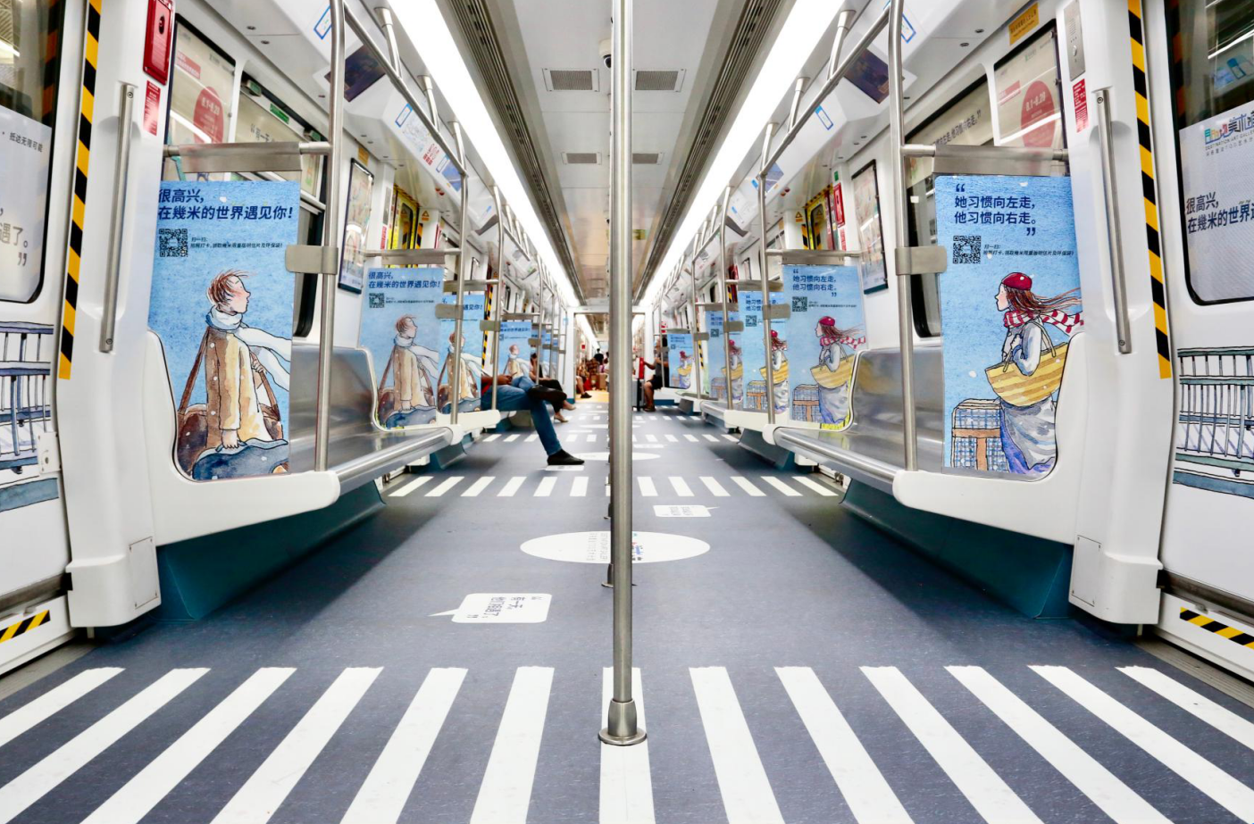 “我信仰藝術(shù),我覺得它太……太厲害了!”因為希望把藝術(shù)的美好分享給所有人,幾米創(chuàng)作時總是盡量把自己最在乎的故事和結(jié)構(gòu)變得更簡單些,打破國界,讓全世界的讀者和畫迷都能在他的故事里找到共鳴與寄托。為了更好地傳遞這種藝術(shù)體驗,本次藝術(shù)計劃還讓幾米筆下的人物走進(jìn)地鐵車廂和站廳,等待人們的不期而遇。觀眾在列車或站點打卡拍照,參與“在幾米的世界遇見你”征集活動,就有機會獲得“目的地美術(shù)館”限量版幾米明信片和環(huán)保袋。