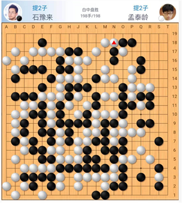 慢棋第三臺(tái)由小將石豫來三段執(zhí)黑對(duì)陣孟泰齡七段。開局黑左上連續(xù)失誤,導(dǎo)致局面早早進(jìn)入不利的戰(zhàn)斗。之后黑棋四處求戰(zhàn)終顯勉強(qiáng),最終以死去中央大龍的代價(jià)吃掉白棋右邊一塊大棋,依然以較大差距落敗,石豫來執(zhí)黑中盤負(fù)孟泰齡。
