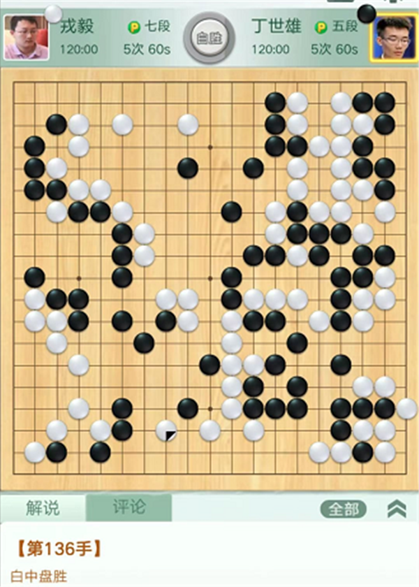 第三臺慢棋,由深圳隊(duì)戎毅七段執(zhí)白對陣衢州隊(duì)丁世雄五段。開局右下角變化黑棋虧損。之后白棋右上角試應(yīng)手時,黑棋選擇脫先吃白中間殘子失誤。白棋棄掉幾子在右上黑空先手活出,大幅領(lǐng)先。之后白棋安全運(yùn)轉(zhuǎn)直至終局,戎毅執(zhí)白中盤勝丁世雄。