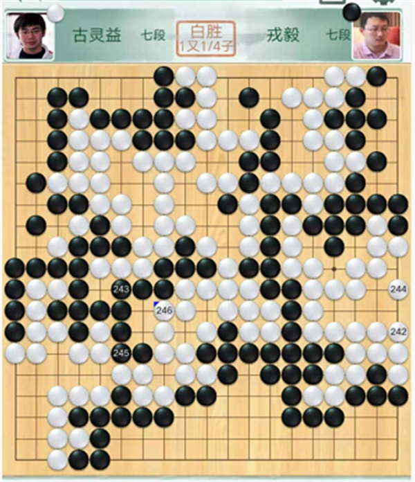 第三臺(tái)快棋,深圳隊(duì)的戎毅七段執(zhí)黑對(duì)陣成都隊(duì)的古靈益七段。黑棋開局采取取地策略。下方黑棋形狀處理保守,子效重復(fù)虧損。之后黑棋一直沒(méi)有明顯勝機(jī),最終以1又1/4子落敗。戎毅執(zhí)黑1又1/4子負(fù)古靈益。