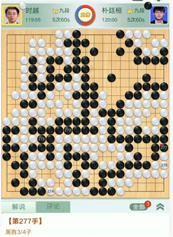 第二臺(tái)主將,由深圳隊(duì)時(shí)越九段執(zhí)白對(duì)陣成都隊(duì)韓國(guó)世界冠軍樸廷桓九段。開局下方雙方各有小失誤,局面均勢(shì)。之后左上黑棋行棋過(guò)分,白棋領(lǐng)先。白棋在黑右上角破空形成打劫,黑棋連走兩手分開右邊白棋進(jìn)行攻擊。白棋治孤中錯(cuò)失簡(jiǎn)明獲勝的下法,但是活出后依然稍好。緊接著白棋沒(méi)有選擇最大的官子,被黑棋走到后黑棋領(lǐng)先。之后黑棋官子收束滴水不漏,以最小差距3/4獲勝。時(shí)越執(zhí)白3/4子負(fù)樸廷桓。