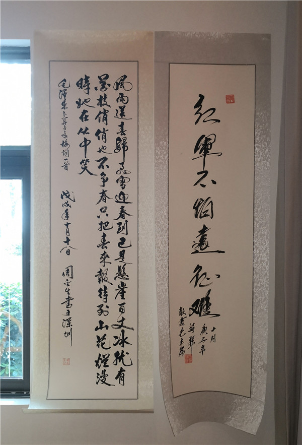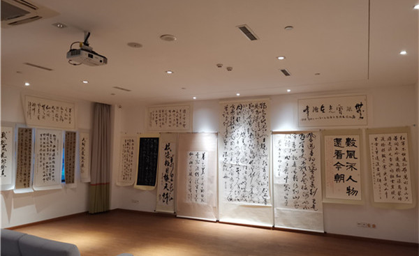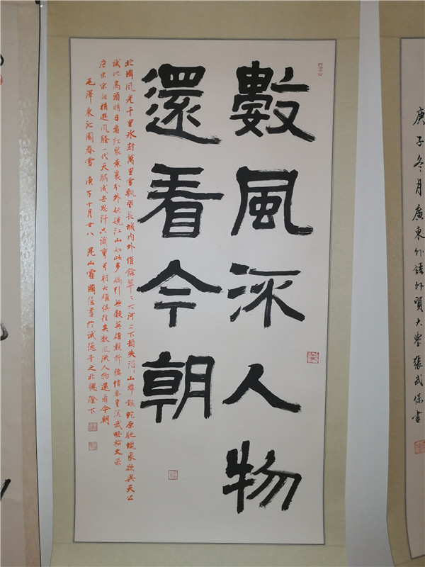 活動(dòng)開始前,與會(huì)嘉賓在服務(wù)人員的引導(dǎo)下參觀了《毛澤東詩詞主題書法展》。展廳布置的作品有40余幅,全部內(nèi)容均為毛澤東同志在革命活動(dòng)所創(chuàng)作的詩詞,或整篇書寫,或取其意。作品形式以橫幅、斗方、條幅、對(duì)聯(lián)為主,字體多為行草,間有楷書隸書,書寫者有企事單位的領(lǐng)導(dǎo)、干部和離退休人員。在這個(gè)特殊的日子里,他們以此形式緬懷毛主席的豐功偉績,表達(dá)內(nèi)心對(duì)毛澤東同志的敬意和懷念。