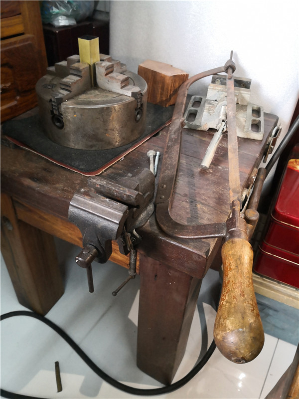 船木工作臺擺的全是寧老師的心肝寶貝:進(jìn)口或定制的篆刻臺、鋸、刀等。