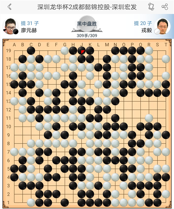 第三臺戎毅對陣廖元赫,開局行至第30、32手時出現(xiàn)失誤,致一隊白子被殲。此后,雖一路奮力追趕,行至309手時依然無力回天,遂認輸告負。