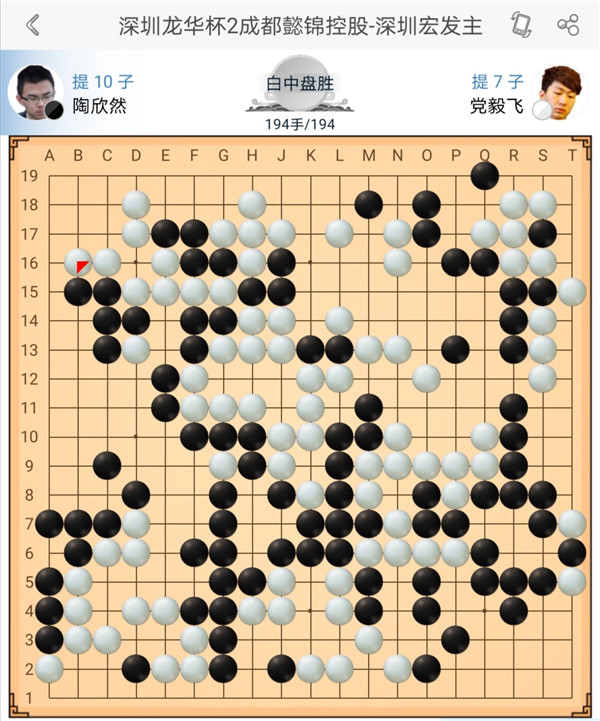 第二臺主將陶欣然執(zhí)黑負于世界冠軍黨毅飛。中盤中腹作戰(zhàn)白棋失誤,轉(zhuǎn)換后黑棋優(yōu)勢。之后左上角黑棋行棋過分,被白棋抓住機會吃住上方四子后一舉奠定勝局。