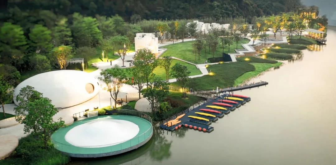 小鎮(zhèn)除規(guī)劃有安藤忠雄禮堂四部曲之一的“詩之禮堂”,還邀請了國內(nèi)外一眾頂級設(shè)計(jì)師參與設(shè)計(jì),張?zhí)凭坝^作品——龍骨樂園、WATG作品——棕櫚樹酒店、鄭東賢作品——高街,還有MORSE COFFEE、社交廚房、深夜食堂等配套建筑,實(shí)現(xiàn)居住、休閑、度假、教育、社交和精神文化等空間一體融合,締造了大灣區(qū)首選的深度休閑度假目的地。