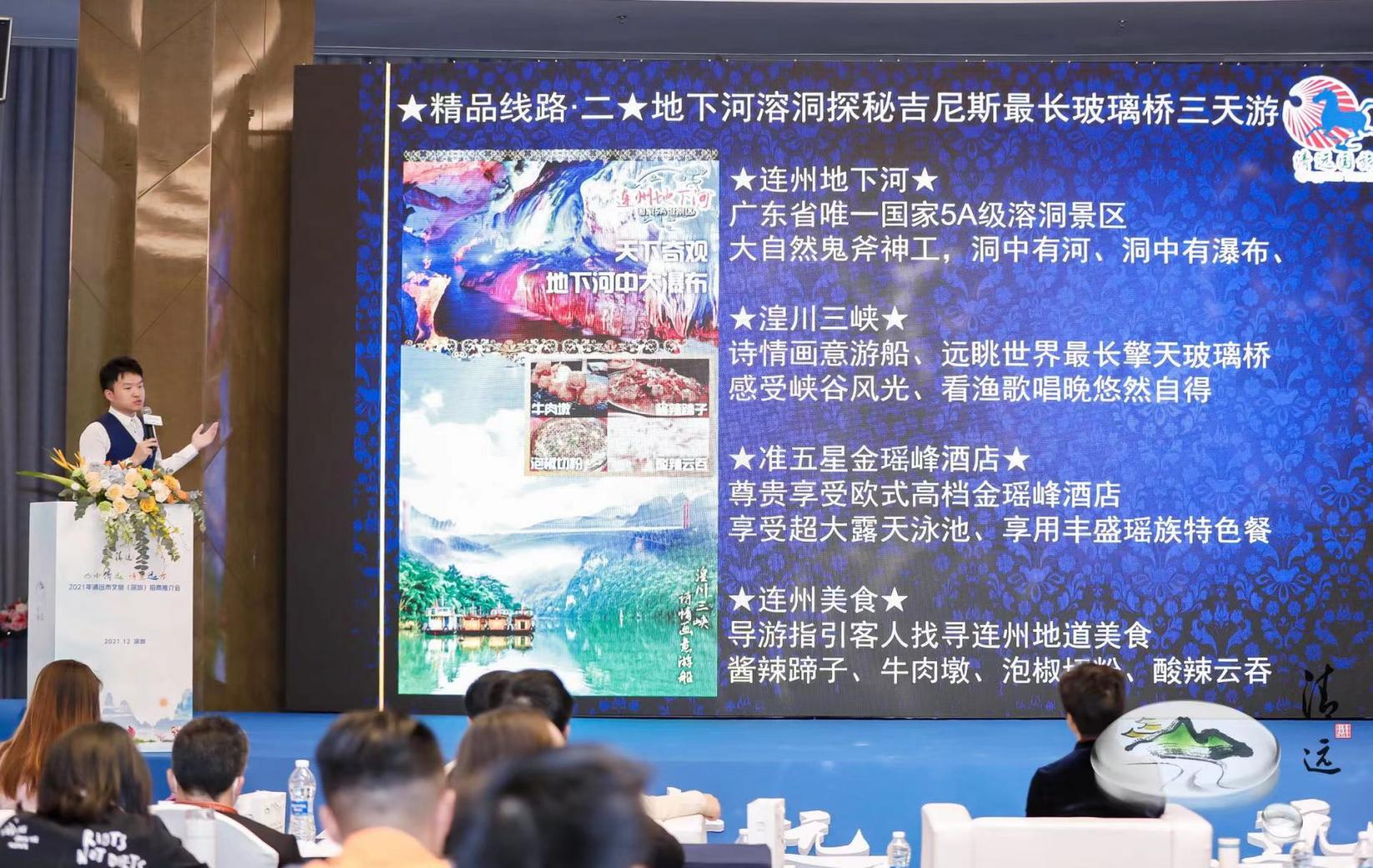 文化是旅游的靈魂,旅游是文化的載體。近年來,清遠依托自然資源稟賦和深厚的文化底蘊,多措并舉推動文旅融合發(fā)展,文旅產(chǎn)業(yè)呈現(xiàn)欣欣向榮局面。現(xiàn)場,清遠市珠水美悅酒店管理有限公司總經(jīng)理宋玉亮、清遠市古龍峽生態(tài)旅游娛樂有限公司營銷專員林嘉儀、清遠市愛地旅游發(fā)展有限公司營銷經(jīng)理楊舒浩、清遠市國業(yè)旅游開發(fā)有限公司常務副總經(jīng)理韓勇,依次以圖文并茂、聲畫結(jié)合的形式,推介了美林湖景區(qū),古龍峽景區(qū),連州地下河、湟川三峽、龍?zhí)犊蜅!⑶嫣觳A?、連州大酒店,峰林曉鎮(zhèn)、洞天仙境,讓與會人員身臨其境感受山水清遠的魅力;清遠市國旅國際旅行社有限責任公司業(yè)務總監(jiān)李國華則現(xiàn)場推介了古龍峽云天玻霸兩天游、地下河溶洞探秘及吉尼斯最長玻璃橋三天游等5條精品旅游線路,現(xiàn)場“種草”清遠眾多網(wǎng)紅打卡點。