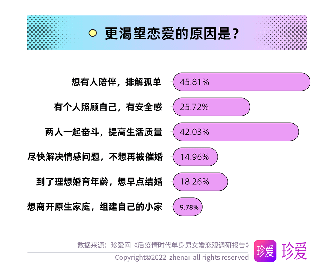 66.54%的單身青年在經歷了疫情后更加渴望美好的愛情,希望體驗愛與被愛、尋求另一半陪伴、兩人共同努力以改善生活是他們期待脫單的主要原因。年輕人對脫單的期待值有著更顯著的提升,并且是出于更加現實和理性的考量——20 -35歲的單身青年們渴望脫單的首要原因是希望找到一位與自己并肩奮斗的伴侶,提升生活質量;35歲以上的受訪者更注重愛情的感性價值,把享受愛情、體驗愛與被愛放在首位。