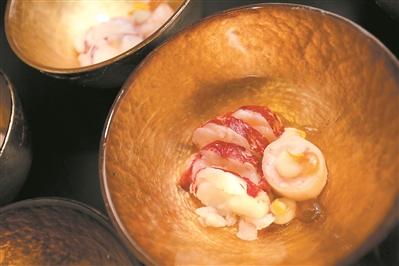 頭盤 “荷塘魚趣”,主角黃花魚來自世界第三大江——長江。步步生蓮是東方禪意,蓮子依依是情誼,蓮藕結(jié)結(jié)是路路通達(dá),Alvin Leung此次演繹的中式料理充滿東方元素,表達(dá)的是和諧交融。主菜“日式鮮味香烤和?!笔侨毡局鲝NHisamitsu Hataji 之作,他用創(chuàng)新手法融入經(jīng)典的日式料理中,表達(dá)一年四季食材與味道的關(guān)系,這是關(guān)于美食的光陰的故事。甜品出自Clement之手,是晚宴甜蜜的句號。